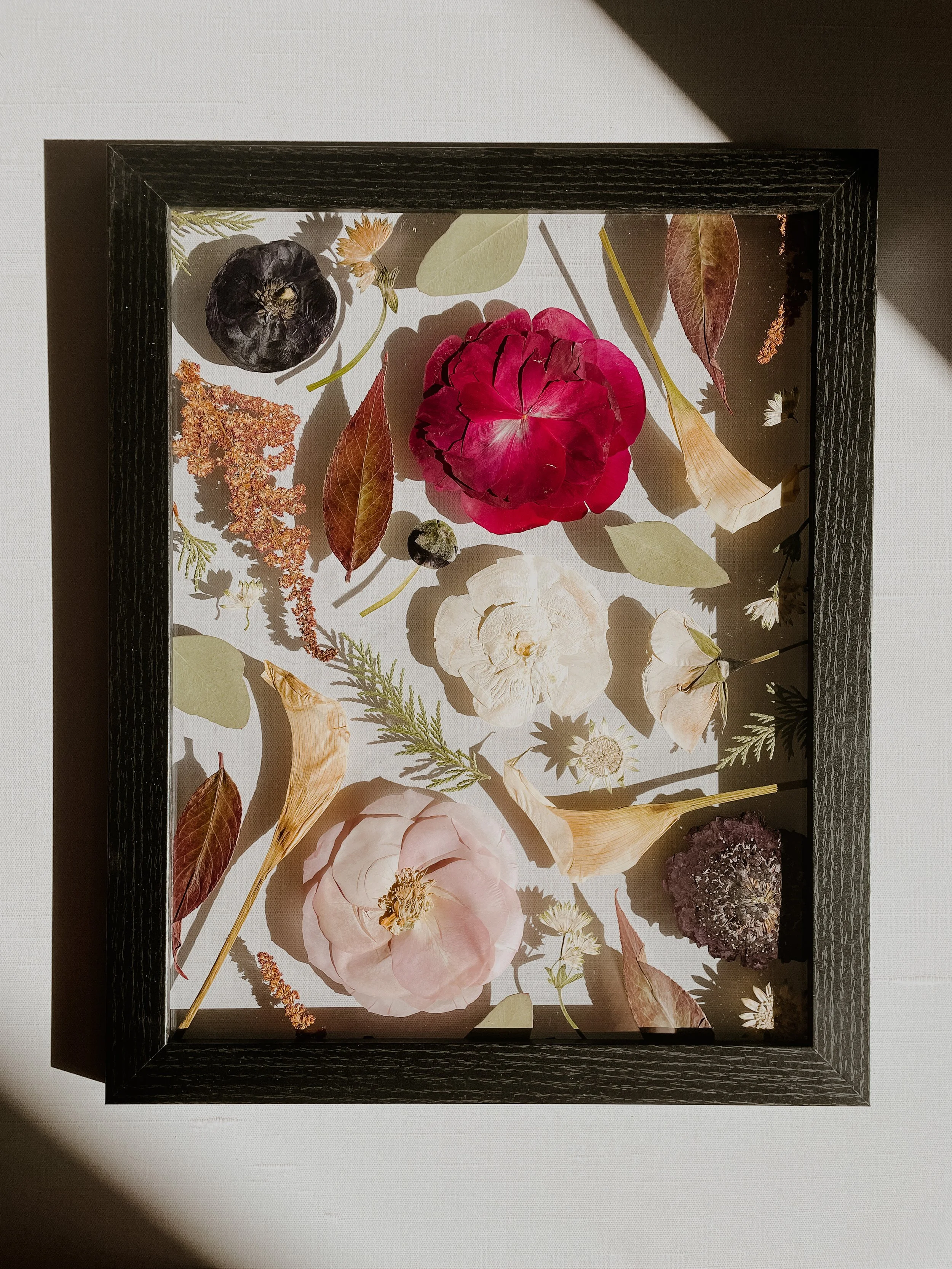 Pressed flowers are preserved by placing blooms and greenery in a traditional flower press for about 4 weeks. This means we place your flowers in between layers of paper and cardboard and apply weight to flatten the flowers completely until they are dry. With pressed designs, we are able to color correct the flowers and also provide the option of a standard frame or a floating frame.